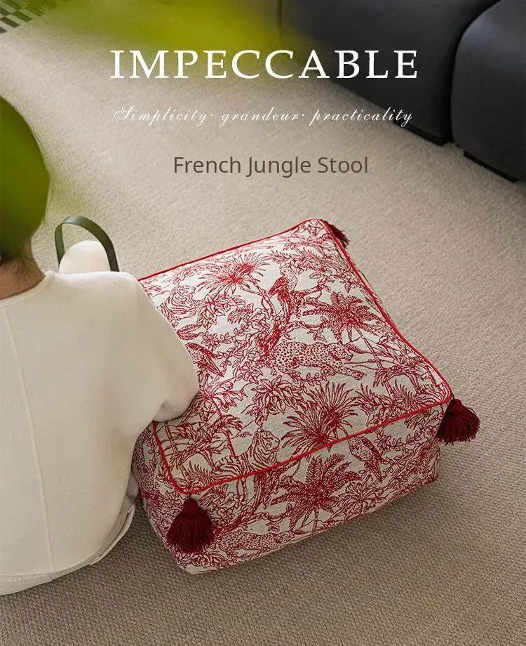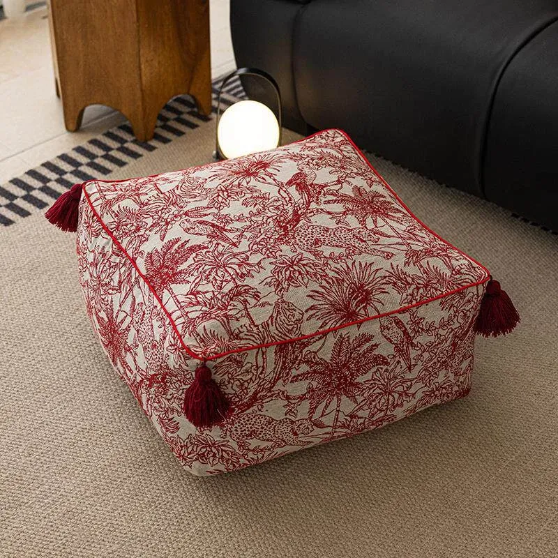 French Jungle Red Square Pouf with Tassel Accents