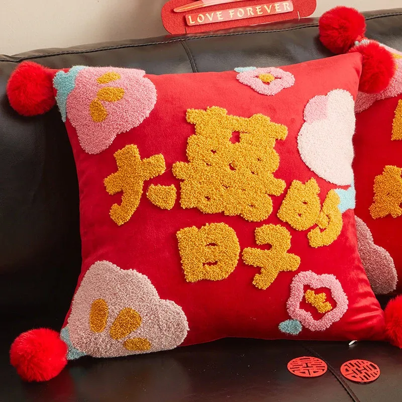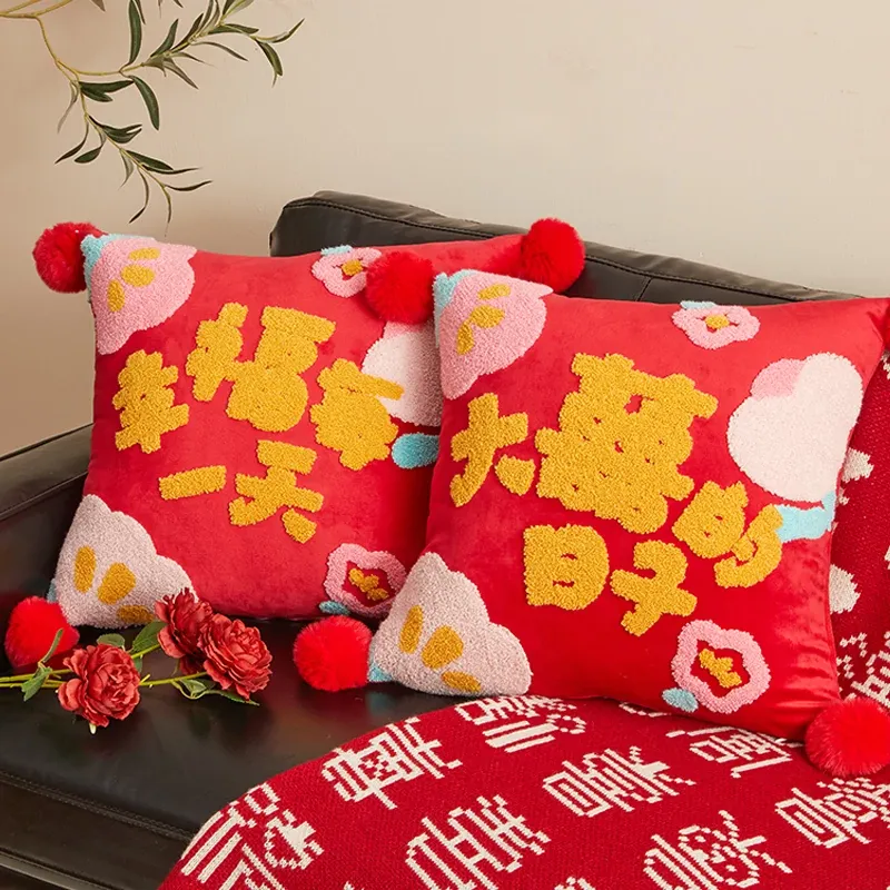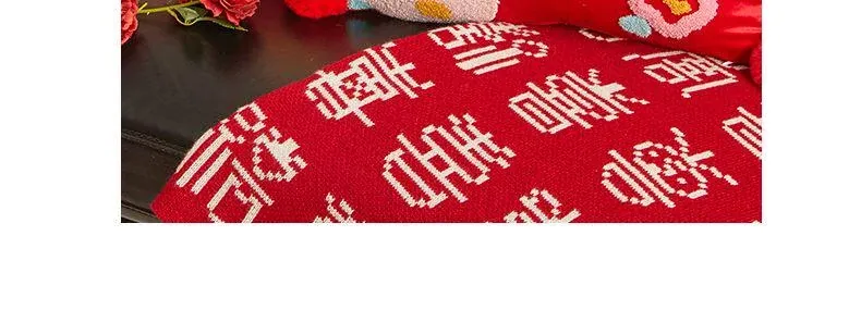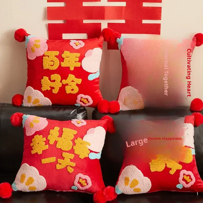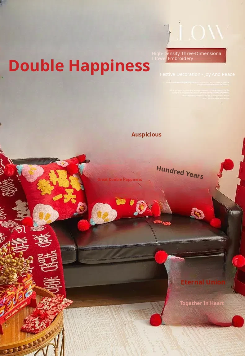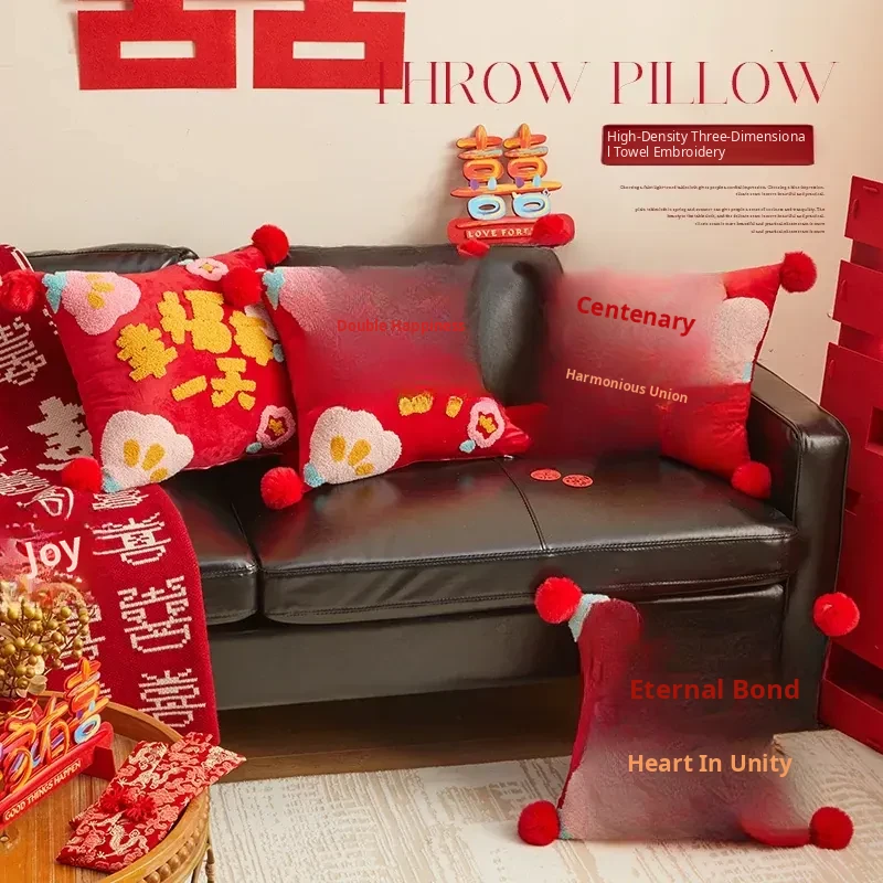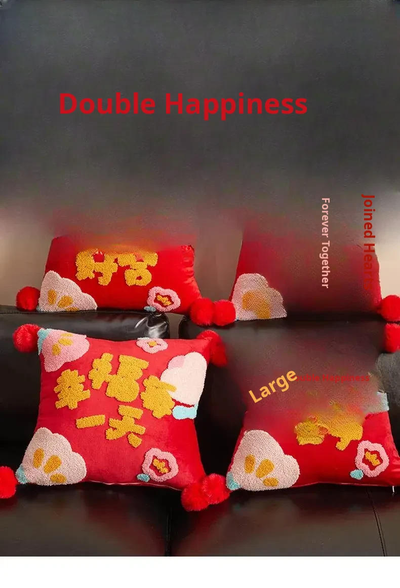 Red Chinese Wedding "Double Happiness" Pillows - Perfect for Marriage Rooms and Living Room Decoration, Ideal Sofa Cushions for Your Special Day