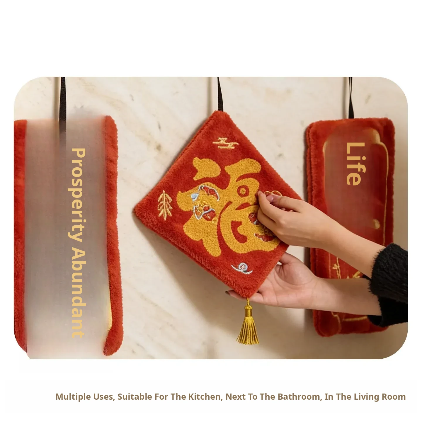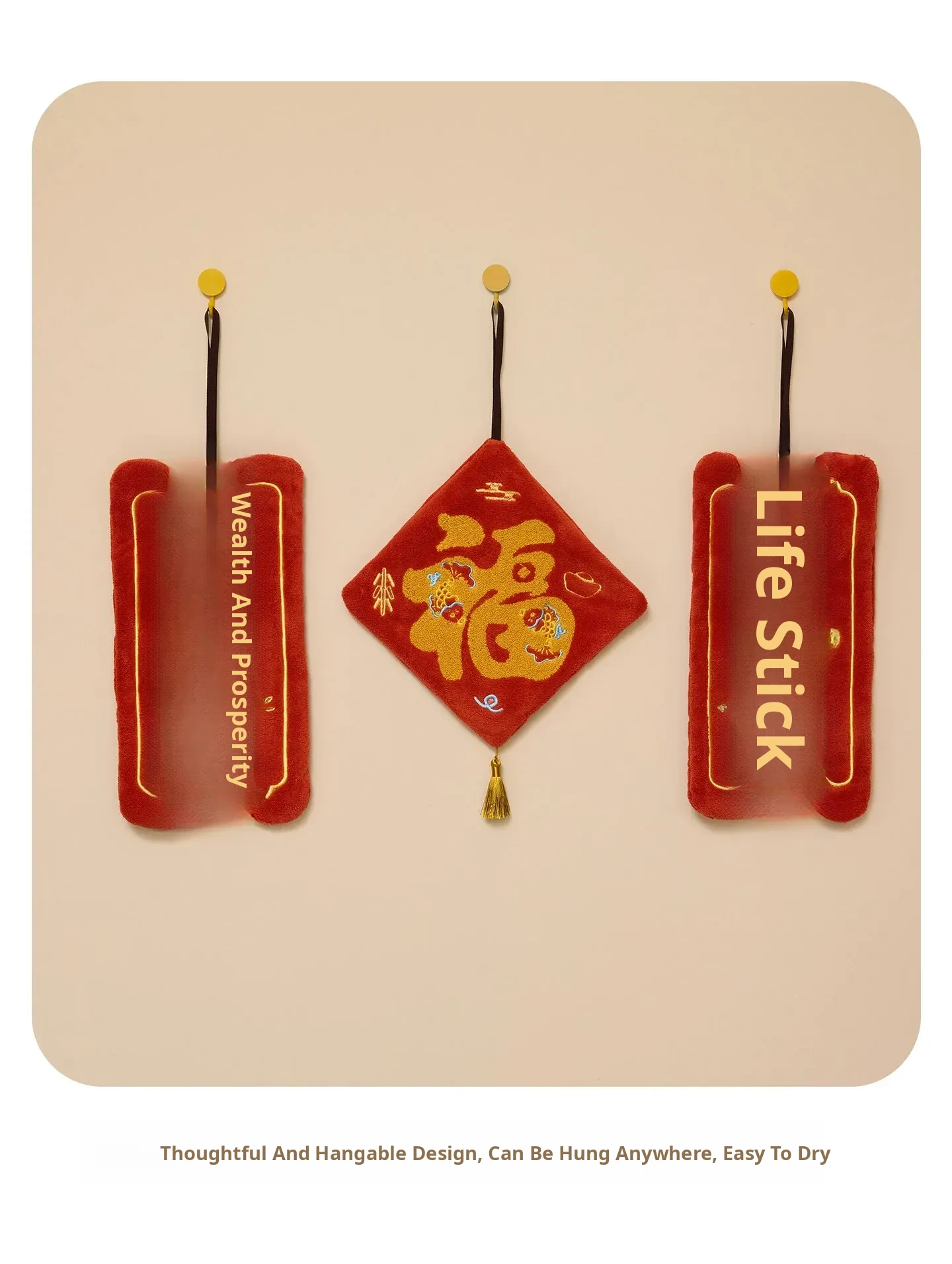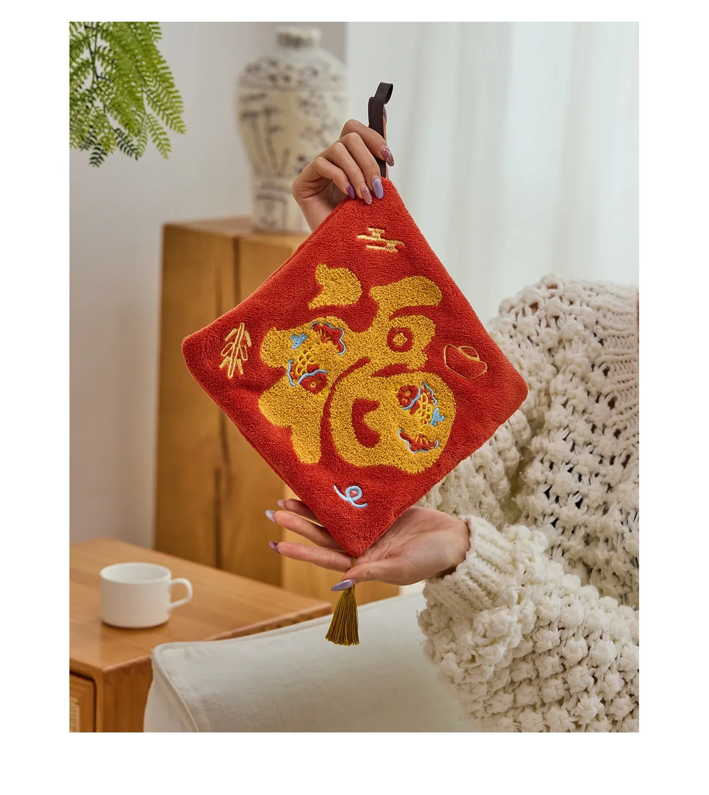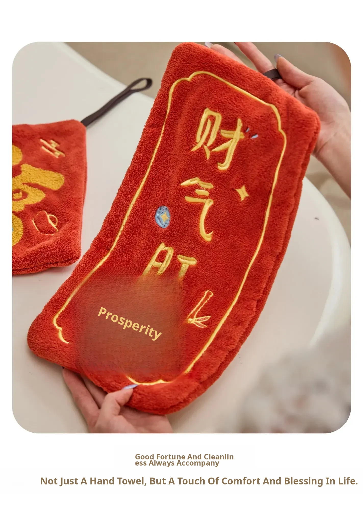 Red Hanging Hand Towel with Blessing Character - Extra Thick, Super Absorbent, Large Size - Perfect for Kids as New Year Gift!