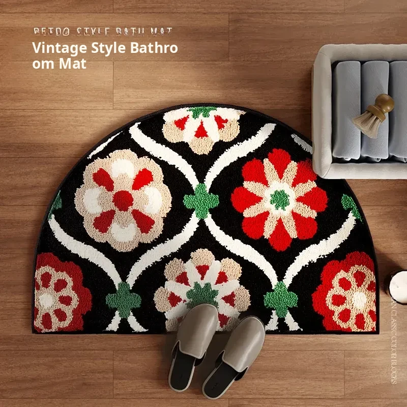 Vintage Style Bathroom Mat - Water-Absorbent Flocking Rug for Dry Areas, American Chic Non-Slip Half-Round Carpet, Perfect for Elegant Home Décor