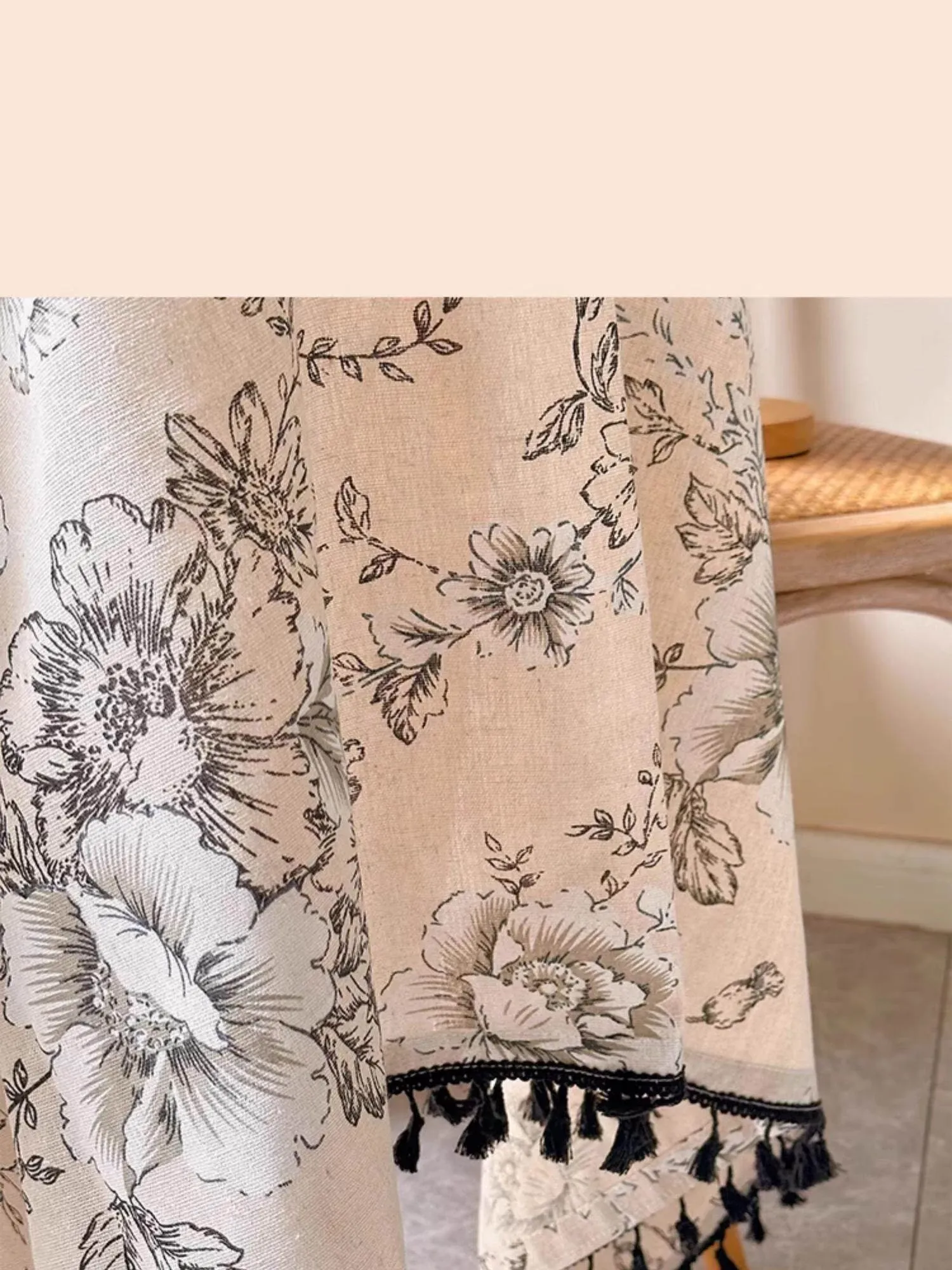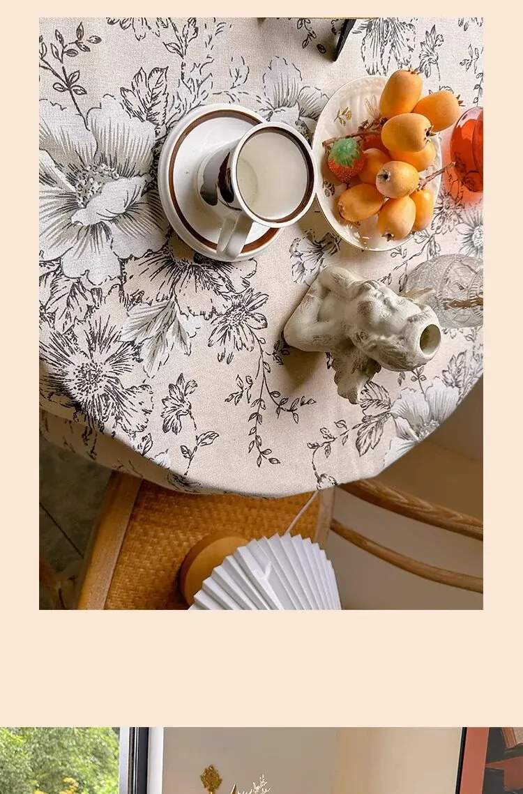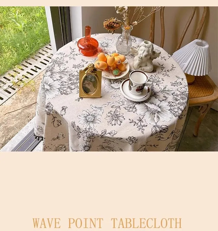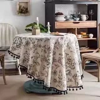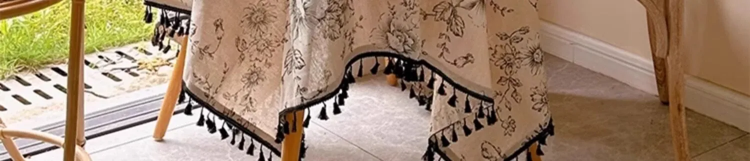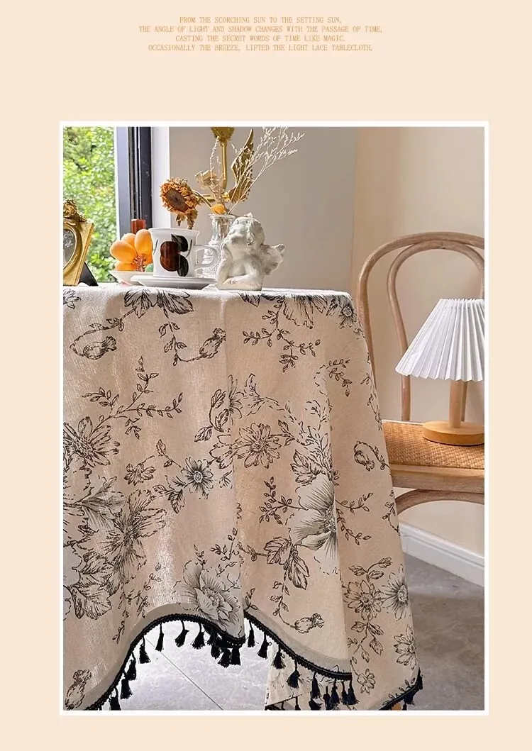 アメリカンカントリー風フラワープリントテーブルクロス|麻感素材で高級感漂うフレンチスタイル|長方形・丸型対応|おしゃれなティーテーブルにぴったりなフリンジ付き!