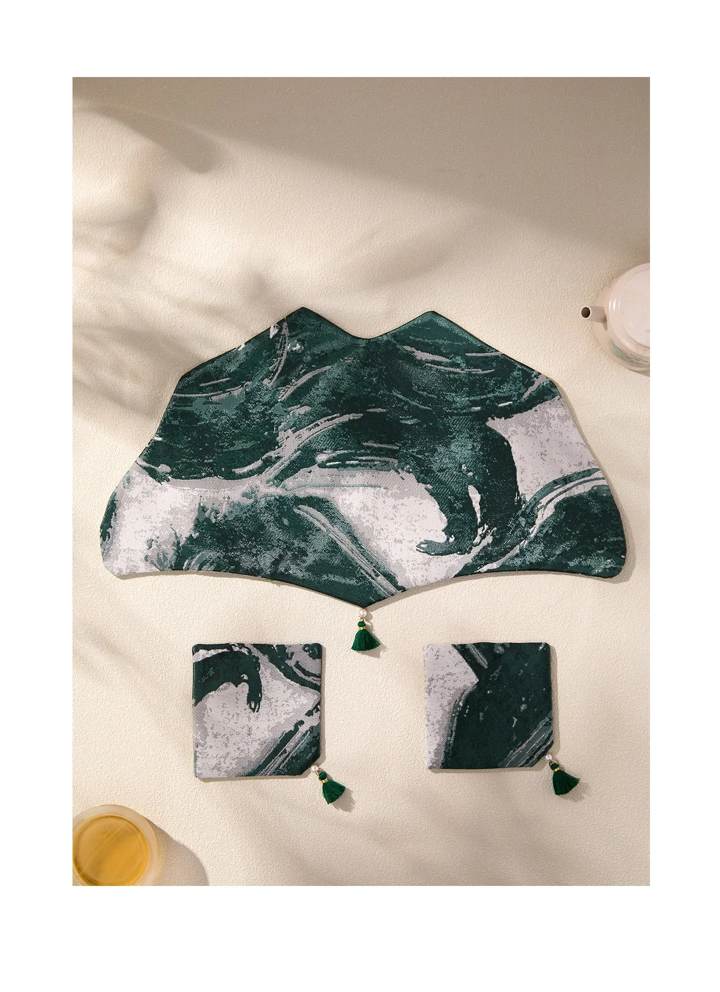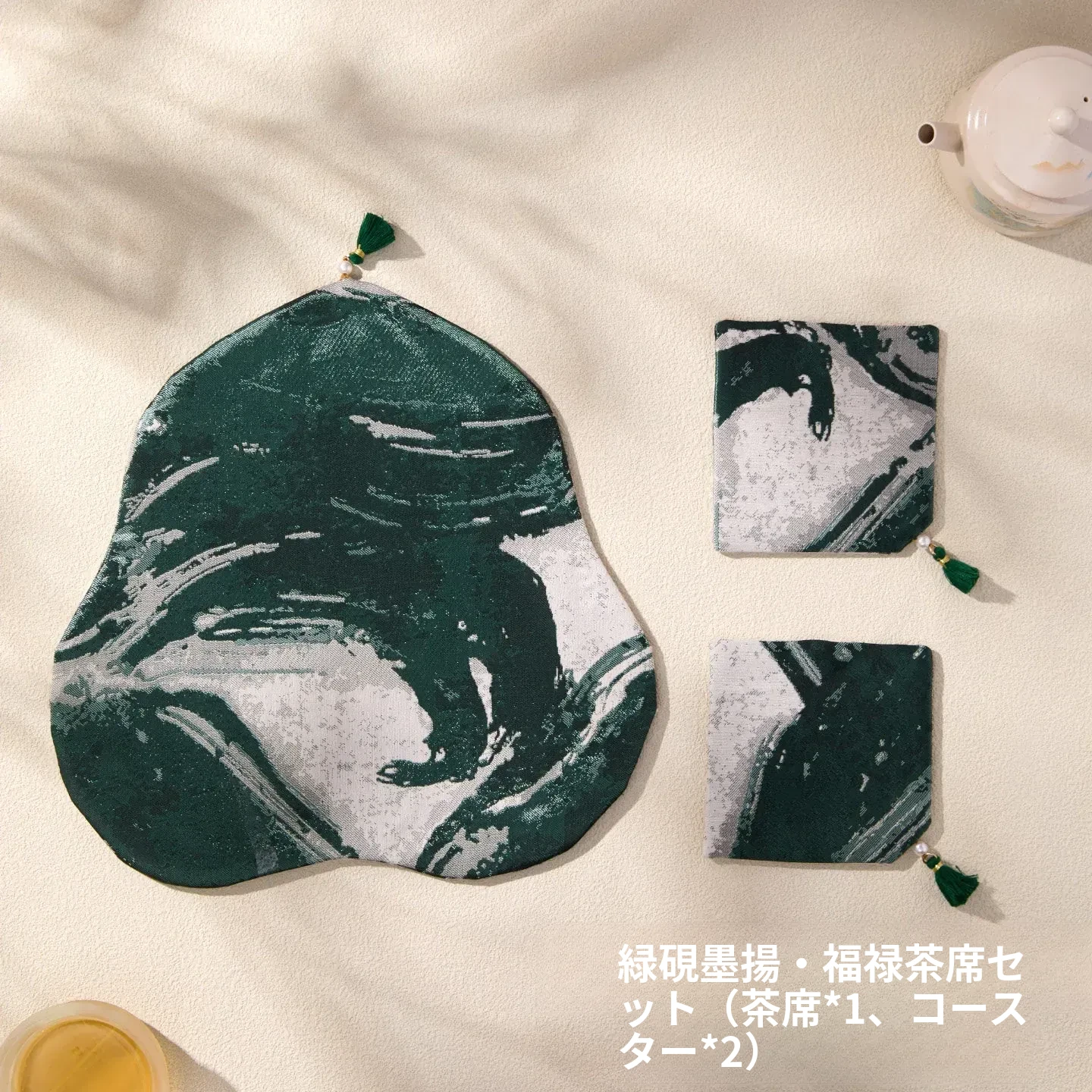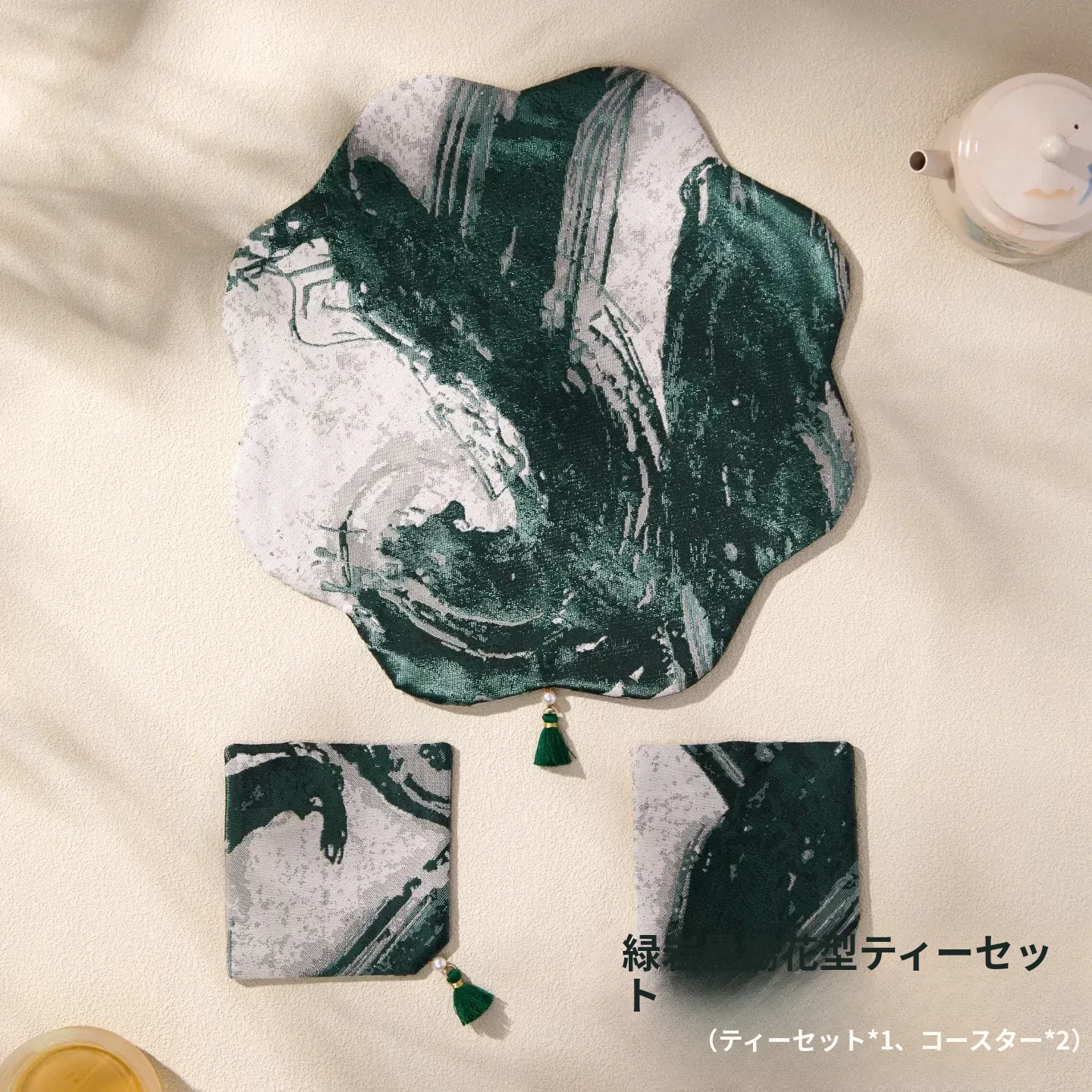 緑砚墨揚花型茶席セット【25*25cm+9*9cm2個】