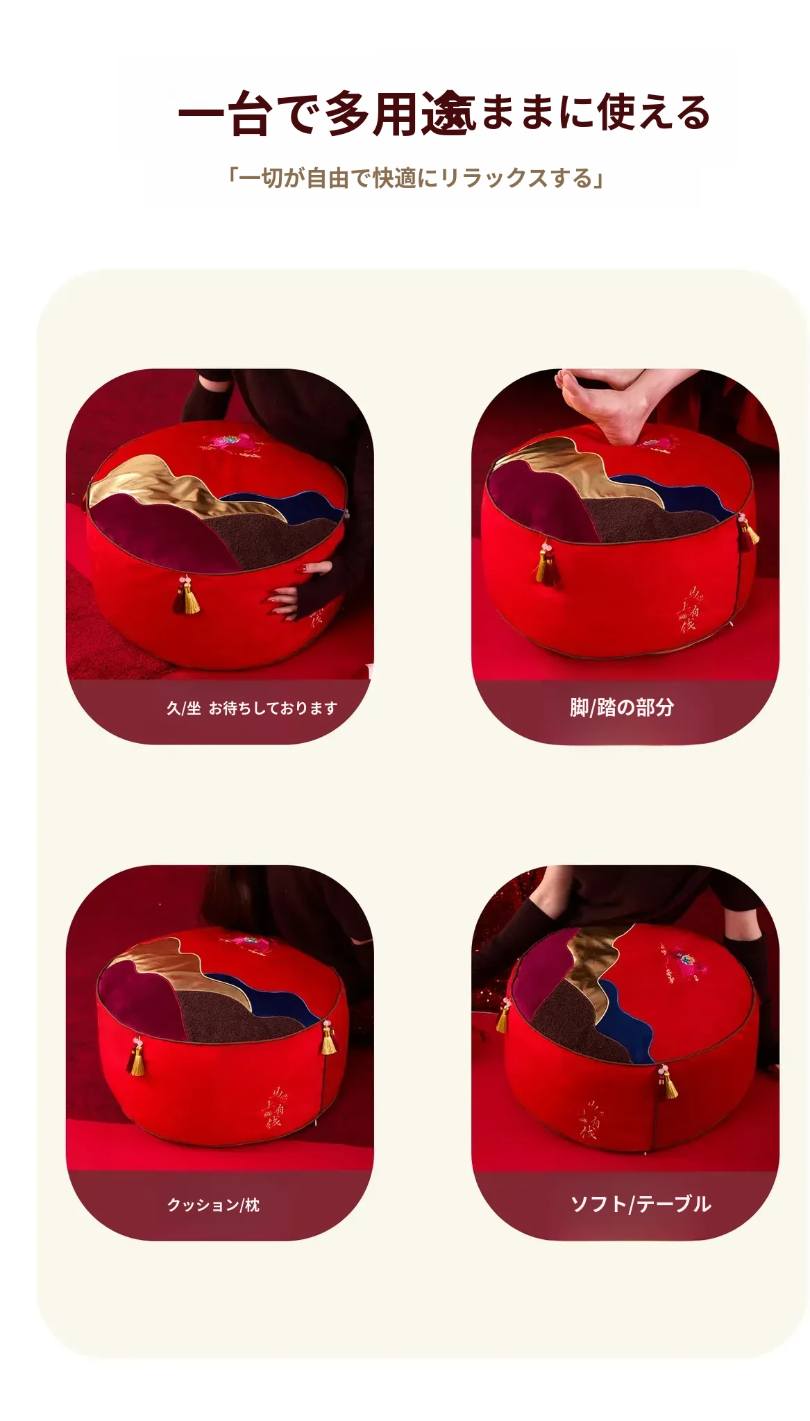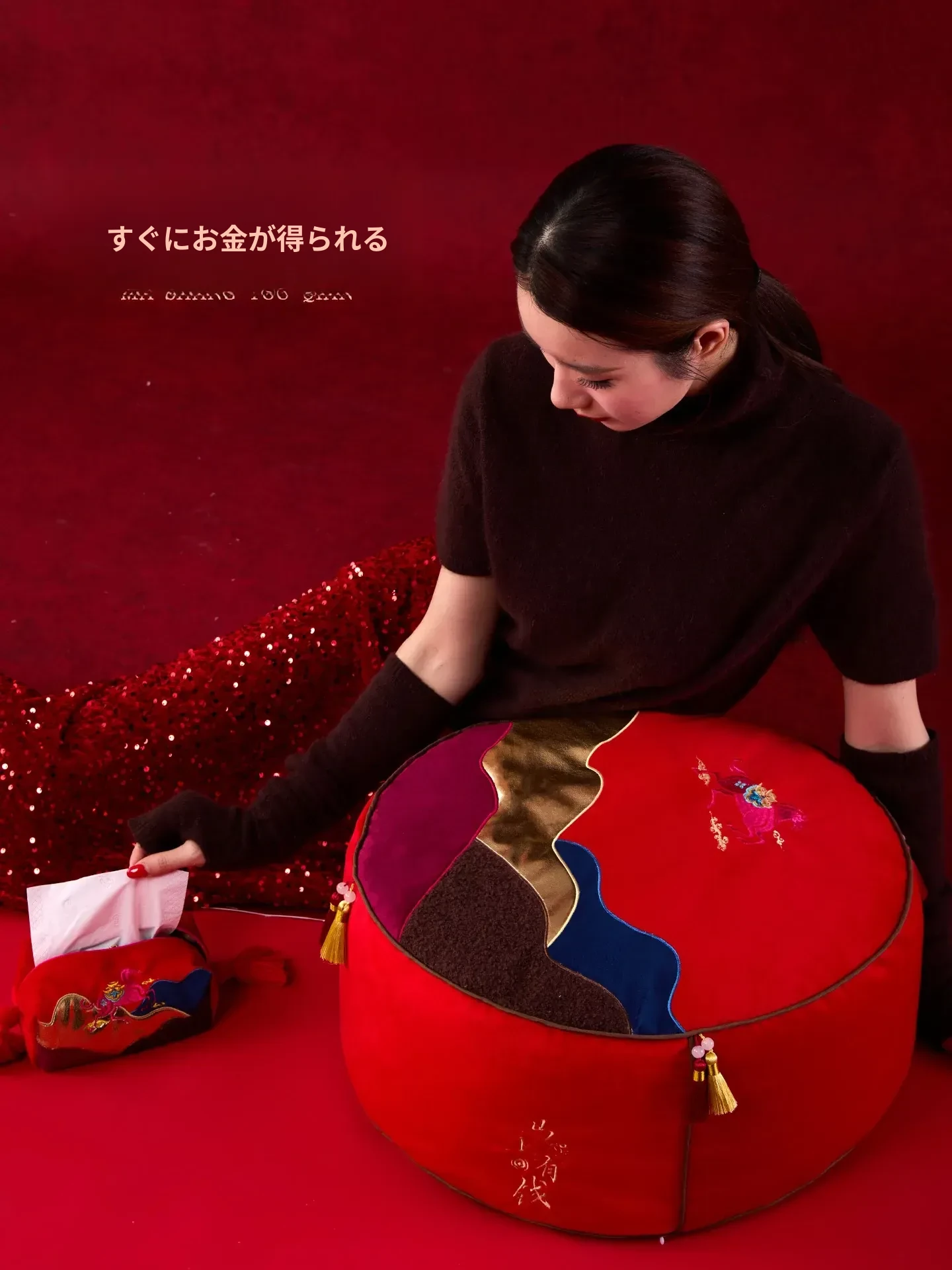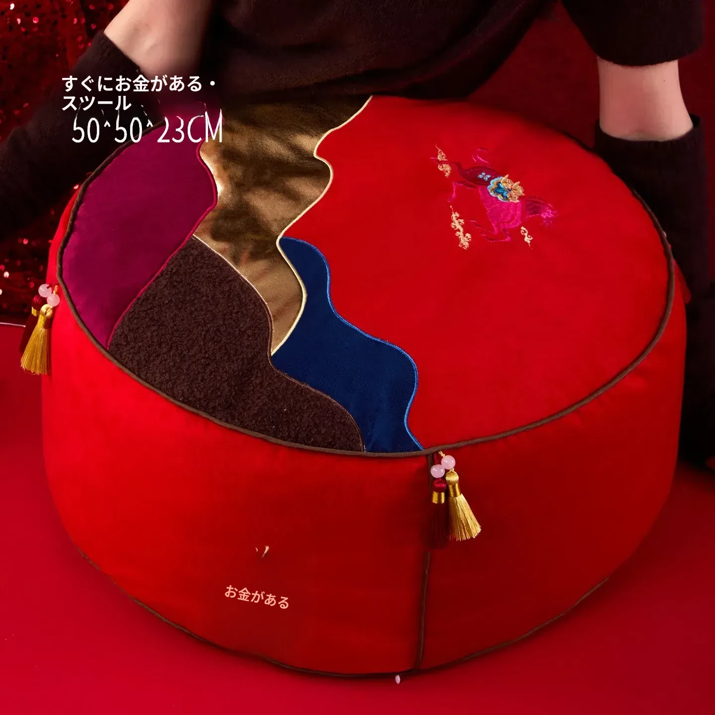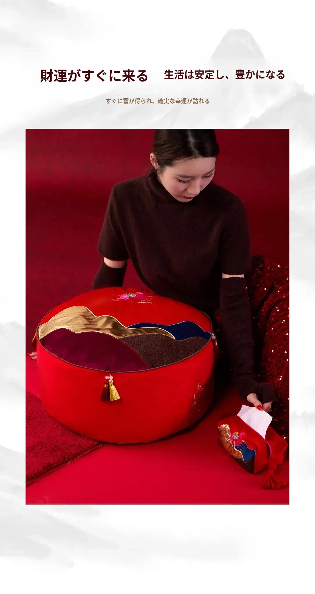 即日手に入る!新中式デザインの楽々座布団、リビングに最適な足置きマット。タタミスタイルの赤色ファブリックは、お祝い気分を盛り上げる!ティッシュケース付きで便利さも抜群!
