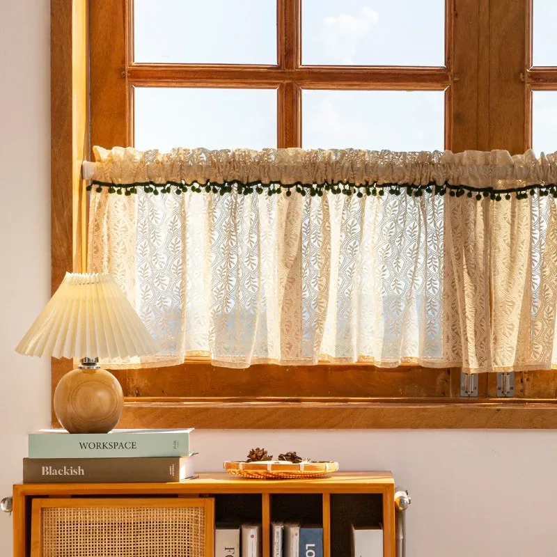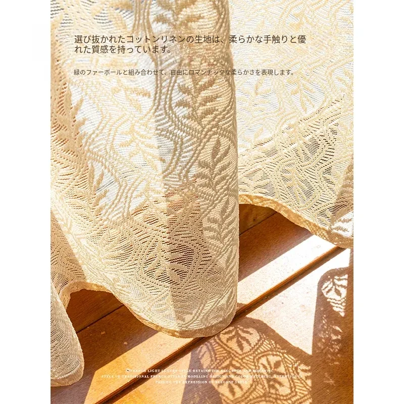 ベージュの葉柄ファー付き短カーテン