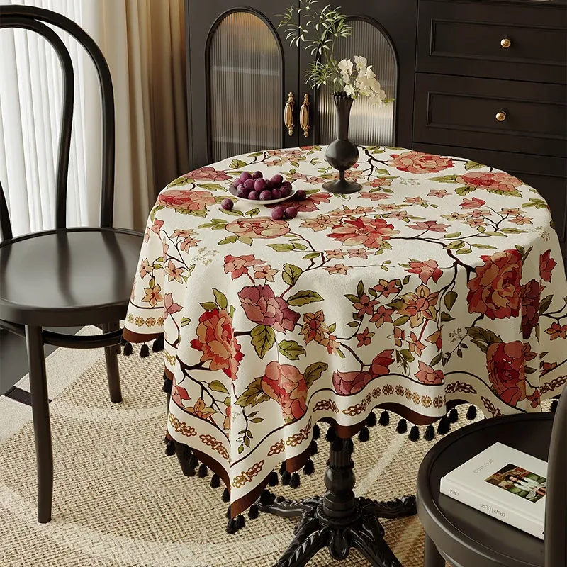 アメリカンスタイルの防熱円形テーブルクロス - フランス風のラグジュアリー感漂う高級感あふれる家庭用小茶卓用カバー、エレガントなフリンジ付き!おしゃれで機能的なテーブルを演出します。