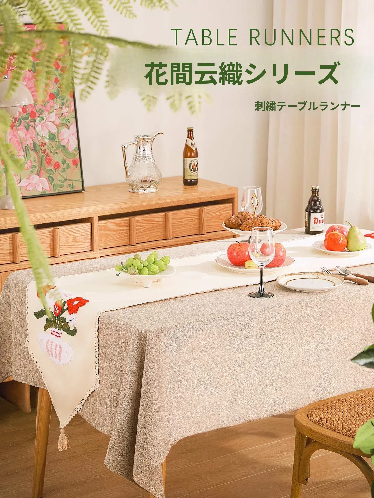 アメリカンカントリースタイル刺繍テーブルランナー - フレンチラグジュアリーの食卓を演出!おしゃれなデザインで、リビングやダイニングを華やかに彩るロングテーブルカバー。テレビ台やサイドボードにも最適なアイテムです。