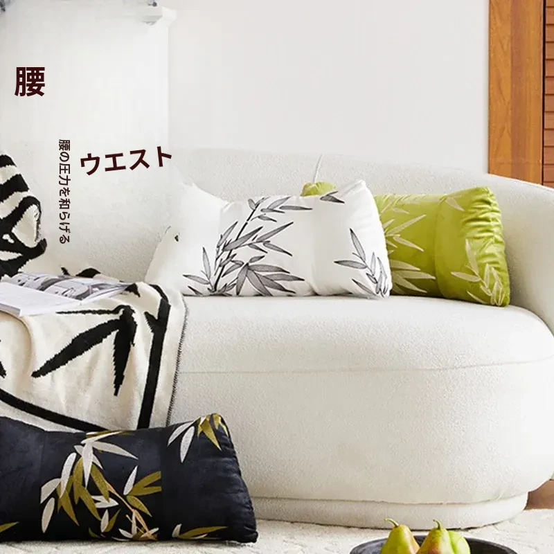 新中式デザインの竹模様クッションカバー - 高級感あふれる緑の腰枕、リビングや窓辺にぴったり!長方形でスタイリッシュなインテリアを演出します。