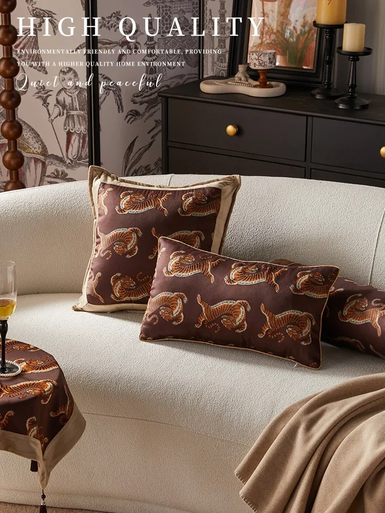アメリカンスタイルのリビングソファクッション - フレンチヴィンテージ風のラグジュアリーな抱き枕、高級感あふれる虎のデザインで、インテリアを華やかに彩ります!中材付きで快適なサポートを提供。